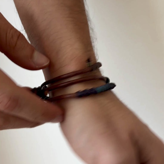 - Material: Blue waxed thread, leather cord, beads and metal closure.